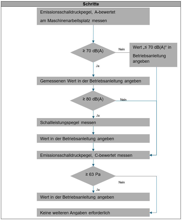 Die Werte werden an der Maschine selbst oder an einem vergleichbaren Modell gemessen. Handelt es sich um eine sehr große Maschine, so können statt des A-bewerteten Schallleistungspegels auch mehrere A-bewertete Emissionsschalldruckpegel an Stellen in der Umgebung der Maschine gemessen werden, an denen sich Personen aufhalten. Hintergrund ist eine kaum mögliche Messung des Schallleistungspegels. Sollte es keine Arbeitsplätze geben, oder diese nicht festgelegt sein, so wird unter folgenden Parametern gemessen: